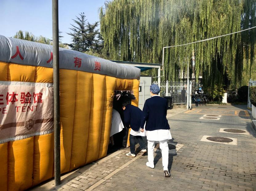仿真消防帐篷还原了火灾现场浓烟弥漫、能见度低的真实环境,并配备电子灭火器供参训人员实操练习。参训职工分组进入帐篷,学习浓烟环境下低姿匍匐前进、辨别安全出口方向、正确使用疏散指示标志的技巧,亲身体验火灾逃生全流程。